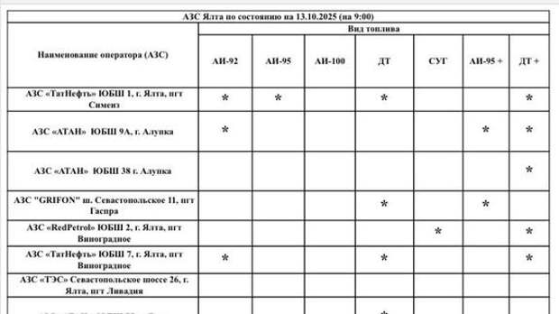 И если в других городах указано: номер заправки, адрес, какой вид топлива имеется в наличие и сколько стоит, то в Ялте вместо цены везде проставлены звездочки.Дефицит бензина в Крыму глава Крыма Сергей Аксенов обещал ликвидировать к ноябрю текущего года в несколько этапов – постепенно увеличивая количество АЗС, на которые завозят солярку и бензин. Обещая это, Аксенов уточнил: план реалистичен на 95%.