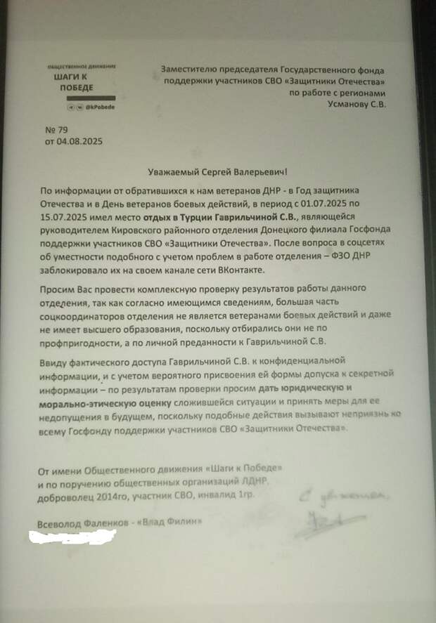 В июле текущего года в соцсетях Донецка возник резонансный прецедент, который затронул вопрос соответствия и ответственности российских чиновников своим местам. Дело было так, ветераны ДНР возмутились фактом отдыха в Турции Гаврильчиной С.В., руководителя Кировского районного отделения Донецкого филиала Госфонда поддержки участников СВО «Защитники Отечества».