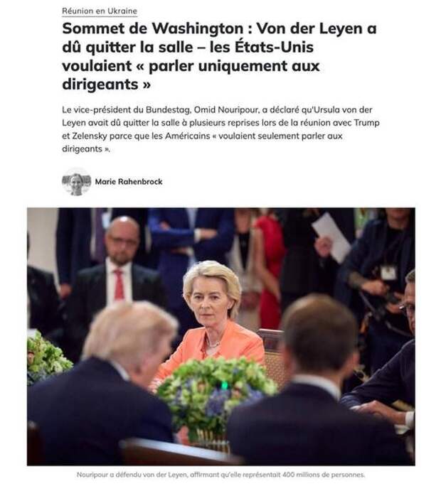 Вице-спикер Бундестага Омид Нурипур заявил, что глава Еврокомиссии Урсула фон дер Ляйен несколько раз была вынуждена покинуть зал во время встречи с Трампом и Зеленским, потому что американцы «хотели говорить только с лидерами».