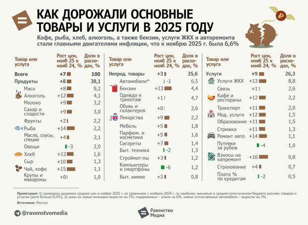 Уровень официальной годовой инфляции за время до ноября 2025 года составлял 6,6%, если верить данным Росстата. Заметнее всего инфляцию подталкивал рост цен на такие значимые товары и услуги, как: кофе, рыба, хлеб, алкоголь, а также обслуживание жилья и авто. Об этом в февральском обзоре рассказали эксперты аналитического ресурса «Равенство».