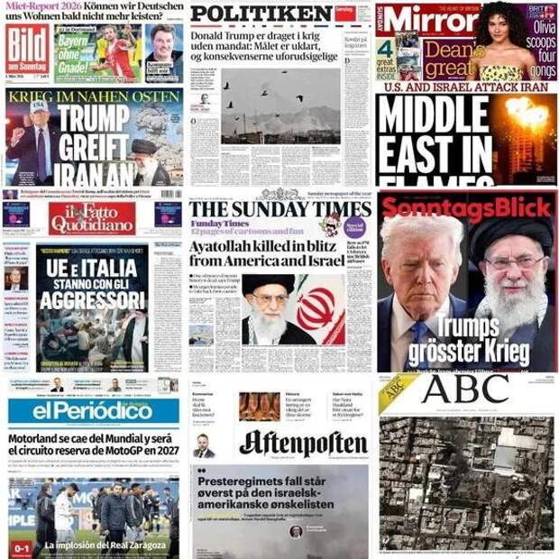 Испанская El Pais также вынесла на первую полосу фотографию разбора руин школы в Минабе.Иначе преподносит события датская Politiken: «Дональд Трамп начал войну без мандата: цель неясна, а последствия непредсказуемы».