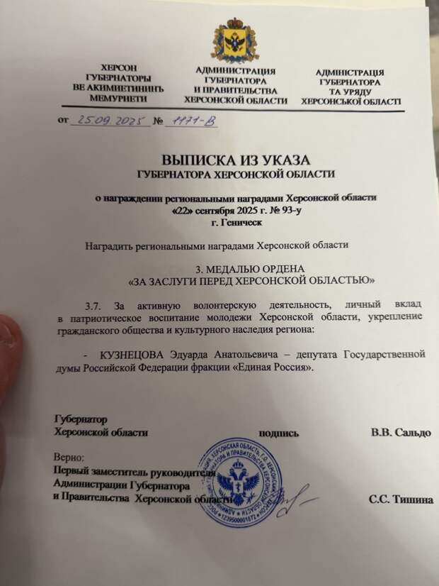 "Для меня большая честь получить эту награду, которая символизирует глубокую духовную связь между российскими регионами, - отметил Эдуард Кузнецов. - Помощь Херсонской области - это проявление нашей общей исторической памяти и культурной близости. Убежден, что именно через такие дела, через конкретную помощь людям, через поддержку тех, кто в этом нуждается, и формируется настоящее единство народов России.