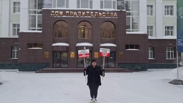 «Выйдите к народу, пообщайтесь с народом!» — призвала чиновников участница одиночного пикета у Дома правительства ХМАО-Югры.