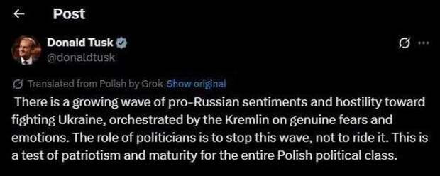 Премьер Польши Дональд Туск очень встревожен реакцией польского сегмента соцсетей на инциденты с дронами и, традиционно, обвиняет в росте пророссийских и антиукраинских настроений в Европе — Кремль.