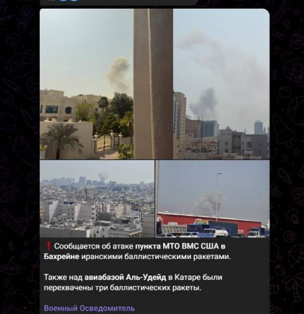 Сообщается об атаке пункта МТО ВМС США в Бахрейне иранскими баллистическими ракетами.