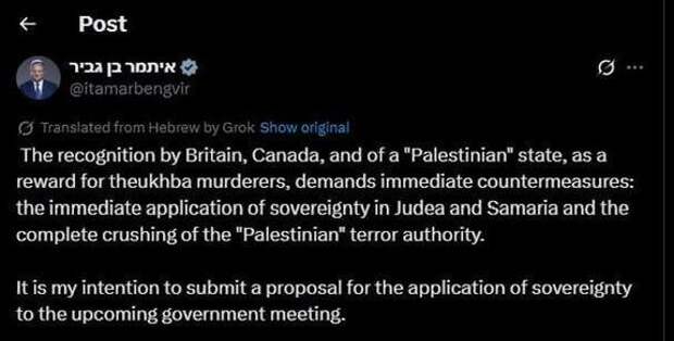 «Признание Великобританией, Канадой и другими странами “палестинского” государства в качестве награды за убийц “эхбы” требует немедленных контрмер: немедленного установления суверенитета в Иудее и Самарии и полного уничтожения “палестинской” террористической администрации.