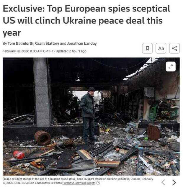 По данным Reuters, несколько европейских руководителей разведки сомневаются в том, что мирное соглашение о прекращении войны России в Украине будет достигнуто в этом году, несмотря на заявления президента Трампа о том, что ведущиеся США переговоры приближают достижение соглашения.