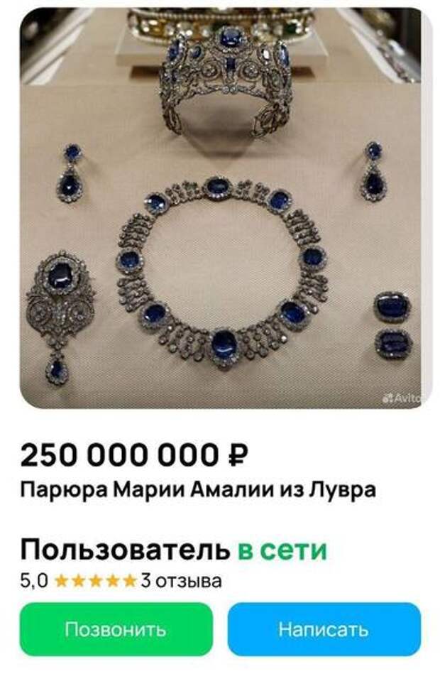 Объявление появилось от пользователя из Москвы ещё вчера. Он разместил фото похищенных на днях из Лувра украшений — диадемы, серёг и ожерелья из сапфиров и бриллиантов, которые принадлежали королеве Марии Амалии. Пользователь оценил их в 250 миллионов рублей. Сейчас его объявление на платформе заблокировано.