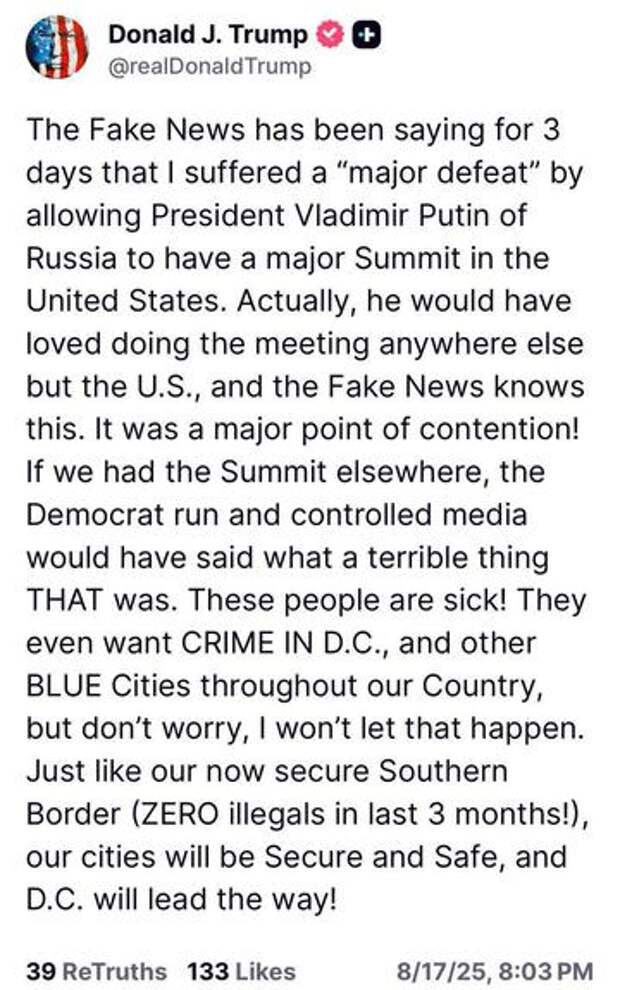 Фейковые СМИ говорят уже три дня, что я получил «крупное поражение», позволив президенту Владимиру Путину провести важный саммит в Соединённых Штатах. На самом деле, ему было бы приятно провести встречу где угодно, только не в США, и фейковые новости это знают. Это был важный предмет спора!