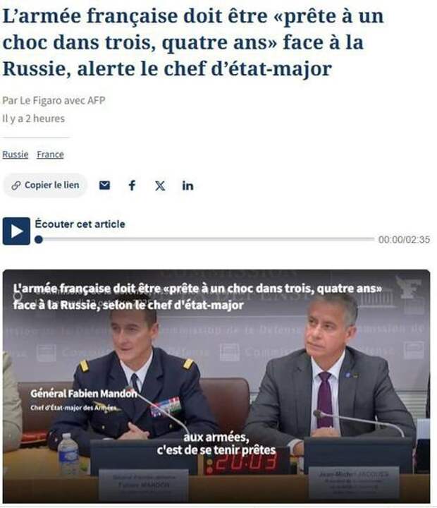 «Первая цель, которую я поставил перед армией, — быть готовыми к столкновению через три–четыре года, которое станет своего рода проверкой: возможно, в виде гибридной войны, через которую мы уже проходим, а возможно, и в виде более жёсткого столкновения», — цитирует Le Figaro военного.