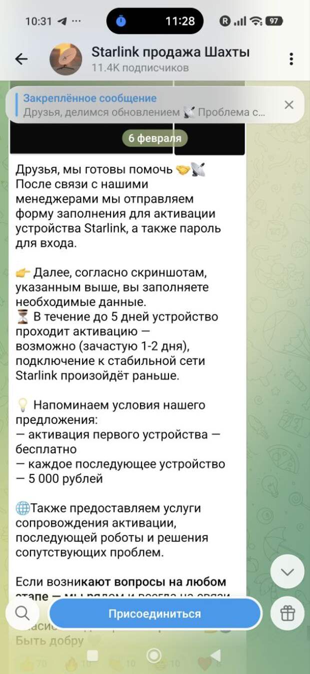 «Создана группа «Satrlink продажа Шахты», в которой предлагают бесплатно восстановить доступ к «Старлинкам». Это при том, что услуги дропа на быв. Украине стоят 10-20 тысяч рублей. Далее предлагают заполнить все данные и отправить их неизвестно кому. Группа новая, аккаунты для связи зарегистрированы 6 февраля. Телефонный номер принадлежит оператору Ip-телефонии (такие используют мошенники для звонков)», — значится в посте военкора.