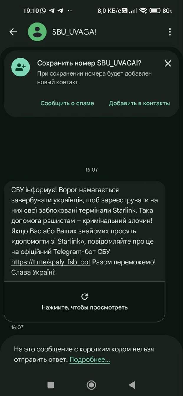 - Тревожно быть в техническом отставании… Но вернемся к нашему случаю. Вчера также, стало известно об импровизированной украинской «жалобе»: «СБУ информирует! Враг пытается завербовать украинцев, чтобы зарегистрировать свои заблокированные терминалы Starlink. Такая помощь рашистам – криминальное преступление! Если Вас или Ваших знакомых просят «помочь со Starlink», сообщайте об этом на официальный Telegram-бот СБУ». Далее приводят ссылку для перехода. Как можно объяснить высокий интерес с нашей стороны и возмущение со стороны киевских «помощью москалям»?