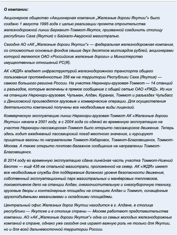 Председатель Правительства Республики Саха (Якутия) Кирилл Бычков поздравил коллектив компании «Железные дороги Якутии» с юбилеем, подчеркнув, что развитие железной дороги дало новый импульс для Томмота, сделав его важным транспортным узлом. За добросовестный труд, высокий профессионализм и вклад в социально-экономическое развитие Республики Саха (Якутия) он вручил Благодарственное письмо Председателя Правительства Республики Саха (Якутия) коллективу АО «АК «ЖДЯ», которое принял генеральный директор Василий Шимохин.