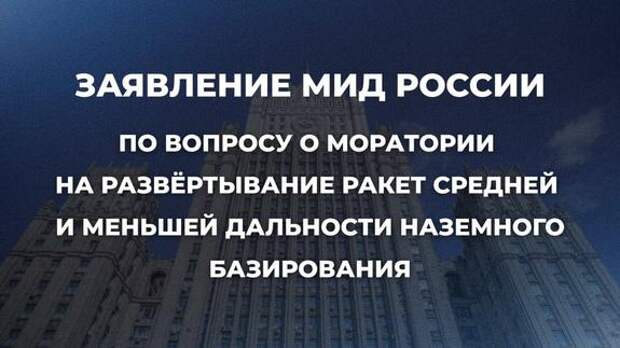 Так как наши многократные предостережения на этот счёт были проигнорированы и ситуация развивается по пути фактического размещения наземных РСМД американского производства в Европе и АТР, МИД России констатирует исчезновение условий для сохранения одностороннего моратория на развёртывание аналогичных вооружений и уполномочен заявить, что Российская Федерация более не считает себя связанной соответствующими ранее принятыми самоограничениями.