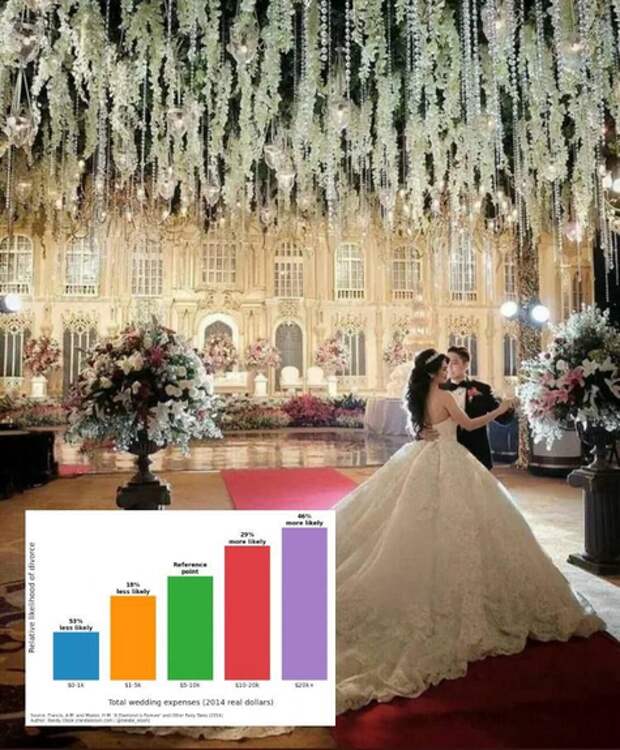 Затраты свыше $20 тыс увеличивают вероятность разрыва на 46%. Скромные свадьбы (до $1 тыс) снижают риск на 53%. Причины — финансовый стресс и импульсивность.