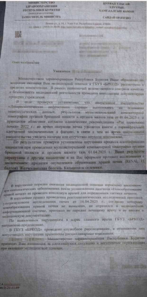 Результаты КТ Тамары перепутали с результатами другого пациента! В Следственном управлении СКР по Бурятии сообщили, что ведётся расследование этого вопиющего случая, которое должно установить обстоятельства и причины произошедшего. Наверняка виновного всё же найдут.Но есть два существенных вопроса: как жить дальше женщине, которая в результате грубейшей ошибки фактически стала инвалидом (так как у неё осталась всего одна почка)? И что намерено предпринять министерство здравоохранения региона? Пока республиканский Минздрав... лишь извинился «за причинённые негативные эмоции»...