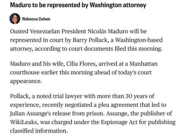 Ранее сообщалось, что защиту Мадуро обеспечит государственный адвокат Дэвид Викстром.