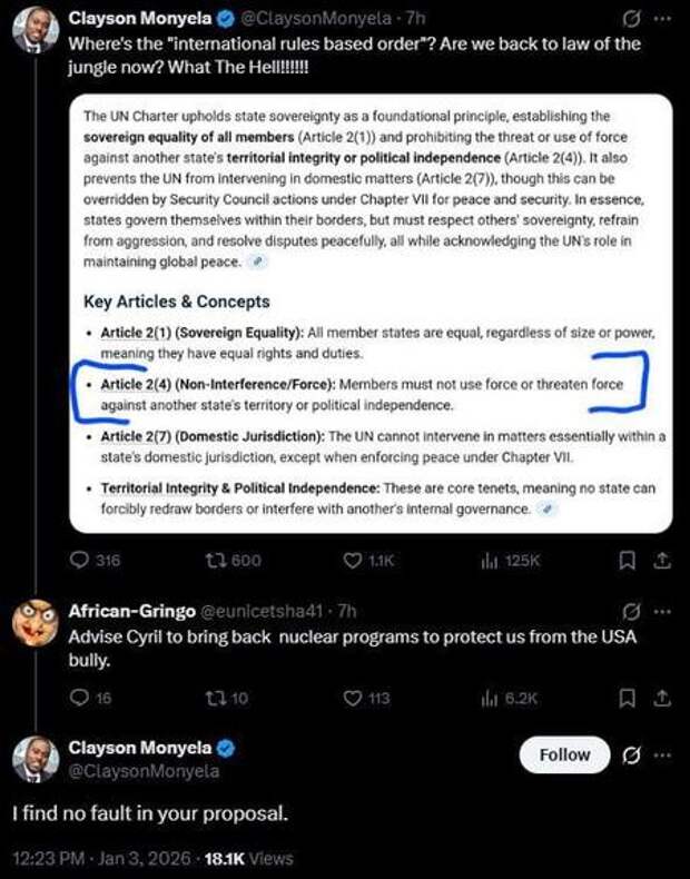 Глава отдела публичной дипломатии ЮАР Клейсон Монела поддерживает идею о том, что Южная Африка должна приобрести ядерное оружие, чтобы защитить себя от Соединенных Штатов.