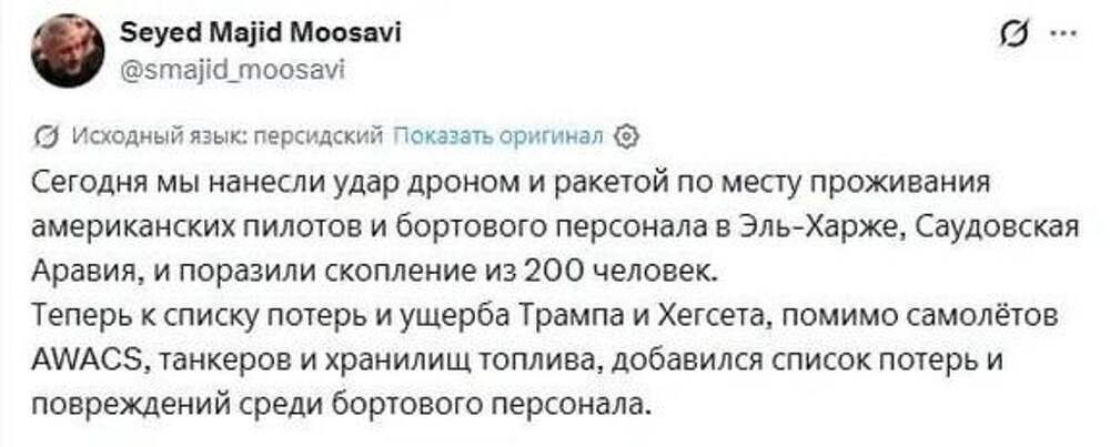 В КСИР заявили об ударе по месту проживания американских пилотов и лётного состава. «Сегодня мы нанесли удар дроном и ракетой по месту проживания американских пилотов и бортового персонала в Эль-Харже, Саудовская Аравия, и поразили скопление из 200 человек. Теперь к списку потерь и ущерба Трампа и... Далее